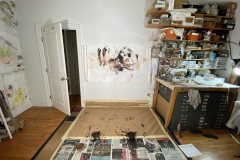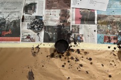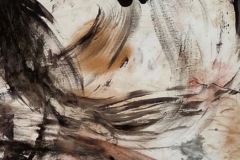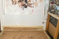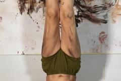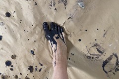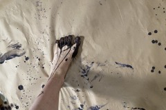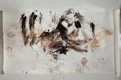 The sound track was pre-recorded (recording & mixing courtesy of Miles Joris-Peyrafitte) to allow me to focus on the physical performance aspect. The text is an assemblage of the “Mahicanituck” song written for the performance “The Bi-Continental Chowder” in the early 2000s & of a second part written over the past week. The background of the live painting is a sheet of paper used as a floor covering & saved from a 2015 action painting. The pigments were a mixture of chewed charcoals burned in the fireplace of our house in my native Pyrenees, pure calcium carbonate (calcite), Ercolano red, terre verte Brentonico, Chefchaouen blue, French clay, bauxite de Tourves, sand from the Narrows; all mixed with water & applied with the feet while in headstand (Salamba Sirsasana II).