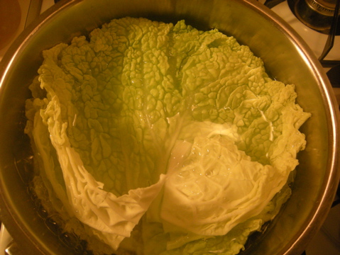 Remove core of cabbage leave and parboil the leaves for a few minutes in simmering water. Drain and reserve.