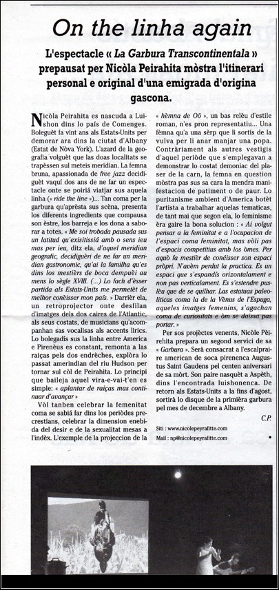 “Performance artist Nicole Peyrafitte serves up some very interesting sound-scapes and emotional improvisations on her new CD entitled “La Garbure Transcontinentale / The Bi-Continental Chowder“. Alternating between French and English poetics, Peyrafitte attempts to help the listener make the connection that she has made through her heuristic research in America and in France… The Bi-Continental Chowder is a very tasty and imaginative work. With Peyrafitte’s vocal borrowings from Meredith Monk and Yoko Ono and a band that lends credence to her vocal explorations, this CD is definitely recommended for those listeners in need of an ear stretching.” — Darryl Gregory