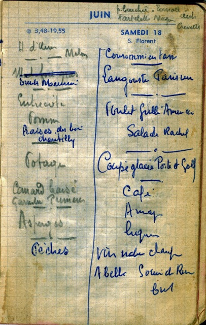 I was born in this hotel, in my parents’ bedroom just above the action and almost in the midst of it. It was June 18, 1960 at noon; the restaurant was running at full capacity. There was a banquet for a 100 top, the annual banquet luncheon for the Master Accountant Guild of the Southwest France region. The interesting fact is that my maternal grandfather, Maurice Gallot, was the president of the guild! My father didn’t get to see me until after the banquet was under control. My mother and I were in good hands between the midwife and her uncle who was a surgeon. My mother still remembers that my maternal grandfather bought champagne for the entire party! As far as the memory of the birth itself is concerned, she would always say: “C’est le mal joli, quand c’est fini on rit!” “It’s the pretty pain — once it’s over one laughs!.” She is always very positive! In case you are curious to know what was served the day of my birth, here it is taken from my grandfather agenda/menu book. The left side of the page is the regular Menu du Jour and the right side is the menu for the banquet.