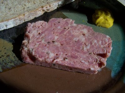 I have to admit, I was not sure what this would be when I started. And I’m still not sure. A souse, coppa di testa, sulze. Not really, those are all set in gelatin. Nor really a pate, because it isn’t smooth and spreadable. Not that a pate de campagne should be. So there it is. And have to admit, this solid toothsome version is much more interesting than the cream-laden versions one normally sees, covered in bacon. If you want bacon, eat bacon. This one is actually cured pork. Very simply seasoned.