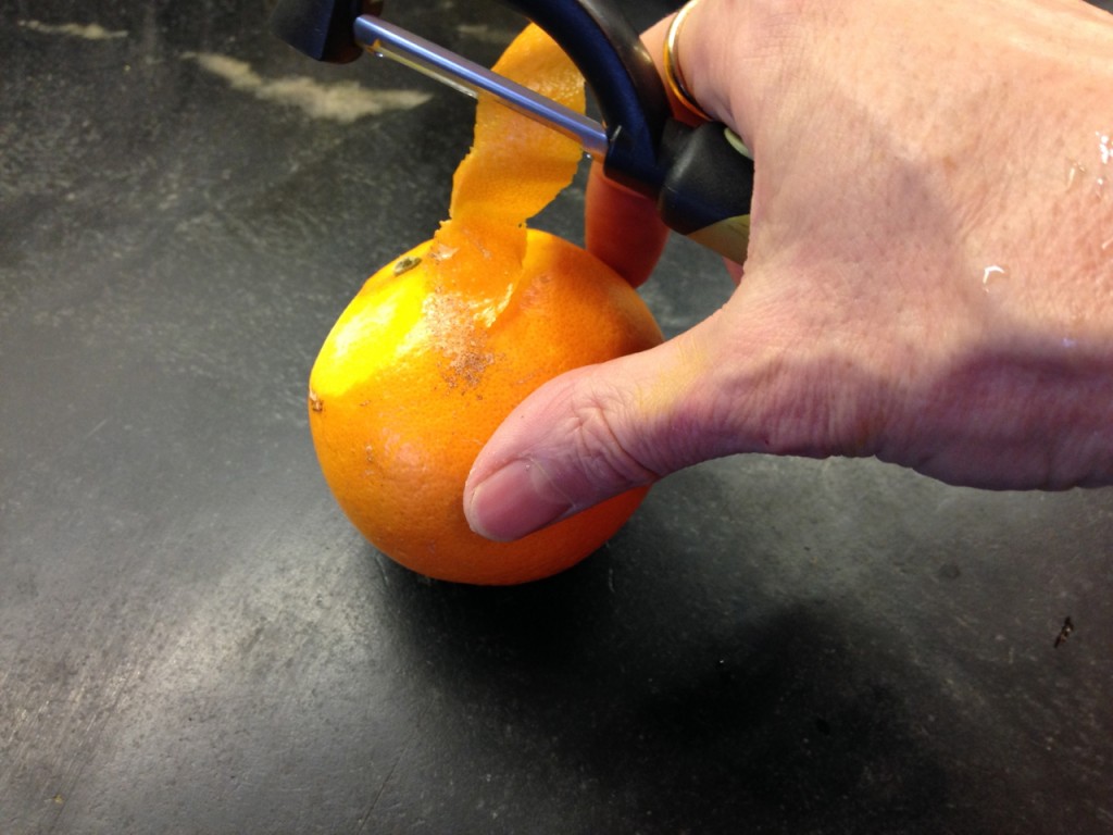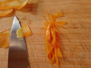 Peler une orange avec un pèle légume. Pour éviter l’amertume ôter la peau blanche avec un couteau à plat (voir photo ci-dessus). Couper en très fines lamelles et faire griller soit dans une poêle à sec soit au four jusqu’à ce que les zestes sont “secs;” faire griller les graines de la même façon. Décorer au moment de servir.