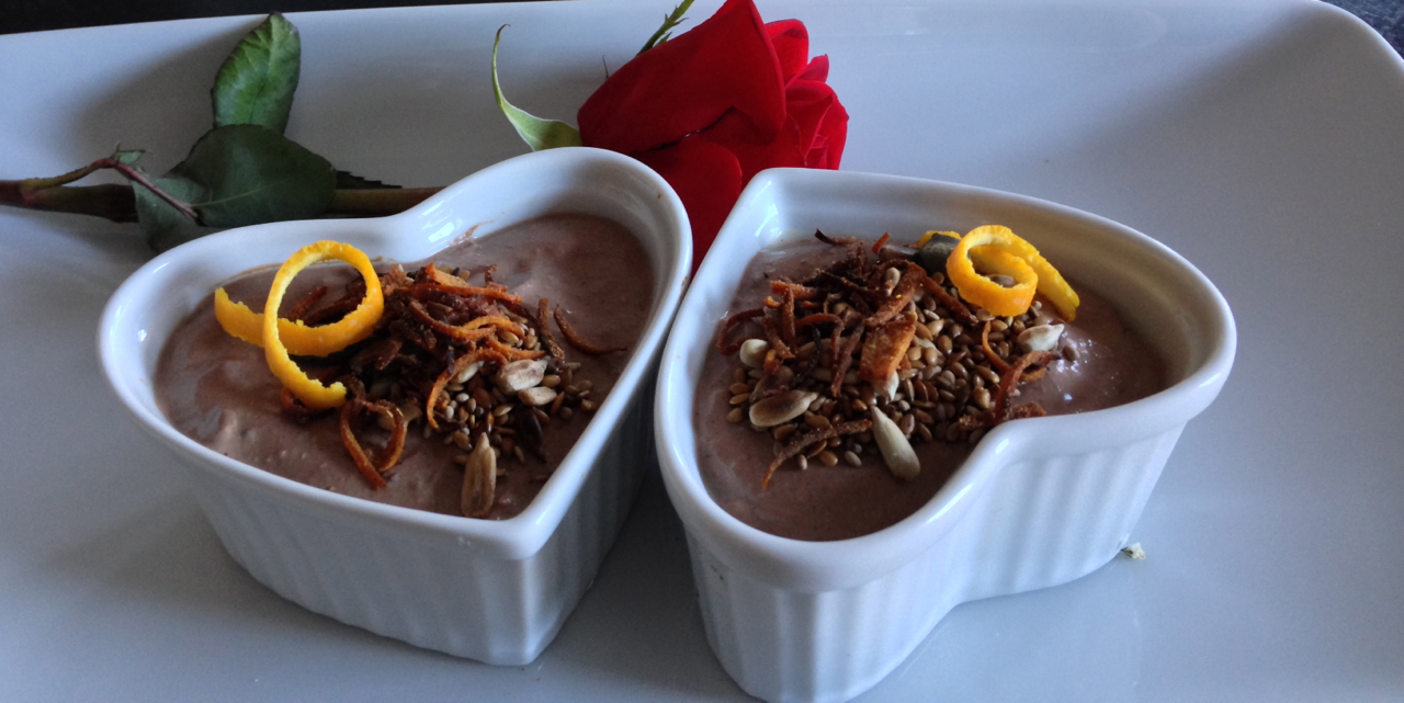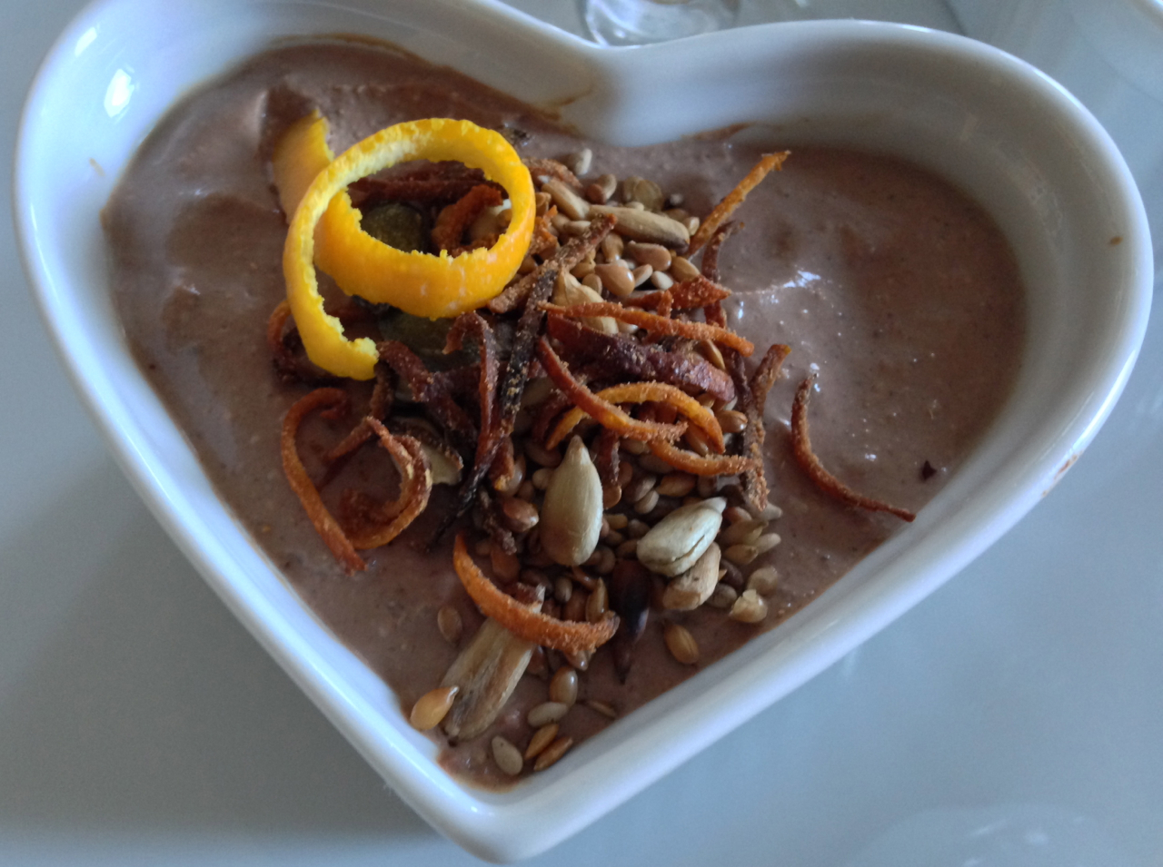 Juste à temps pour la St Valentin, voilà un superbe dessert au chocolat 100% cacao —sans sucre ajouté, sans produit laitier, sans cuisson, pauvre en glucides et en calories. Je l’ai baptisé Mooch-o-colat; la texture onctueuse se marie magnifiquement avec le craquant délicat des zestes d’orange et des graines grillés.