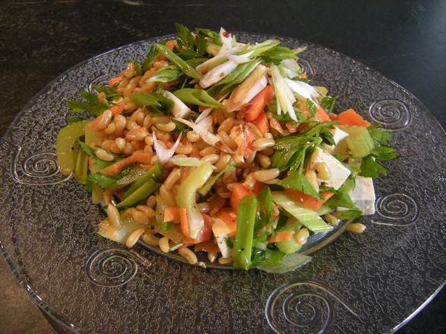Faro, farro, emmer, triticum dicocum or simply put: wheat! Supposedly one of the first wheat domesticated in the Near East. No time to get into its history but it makes a nice crunchy salad. I soaked it for a few hours, cooks it in water, drained it when soft, and added the above ingredients. The ingredients were chosen by default, that is what was available in my fridge. You can get as creative as you want and add things like: nuts, raisins, onions, radishes, peppers, shrimp, chicken, duck — o, yes, duck would be excellent! Just try it.